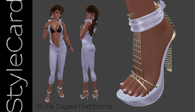 I got these Caged Platforms sent to me this morning, yet another foot-in-shoe release from SLink. The truly unique offering from Siddean Munro looks like a modern art piece, with it's wire cage heel and lattice that extends from the top of the foot to the ankle. The ample platform base and tied leather ankle wrap are color changeable, as are the metals which can be set to your preferred finish. No salon visit is necessary to change the color or your pedicure, and painted details, therewas also not too much difficulty matching my skin tone, though hand entering the RGB gave me an unusual result, I eventually sorted it out with the color palate method and was happy with the look of the skin tone on the prim foot.